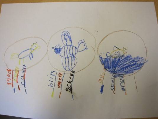Na afloop mag hij de visualisatie tekenen. Hij tekent het paard, de paradijsvogel en de dolfijn en wil daarbij de ik-versterkende woorden schrijven die in de visualisatie voorkwamen. Na afloop krijgt Messi, behalve zijn tekening, nog een plaatje van mij mee met daarop de drie dieren met de woorden uit de visualisatie erbij.